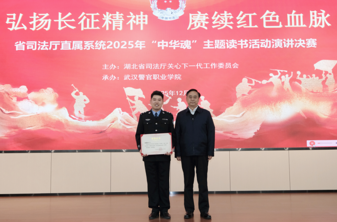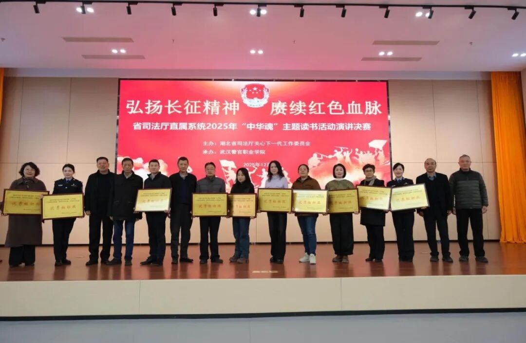 12月9日,省司法厅直属系统2025年“中华魂”(弘扬长征精神,赓续红色血脉)主题读书活动演讲决赛在武汉警官职业学院汤逊湖校区举办。经层层选拔,来自省监狱系统、省戒毒系统和武汉警官职业学院20名选手齐聚一堂,在铿锵话语中回望长征岁月,用真挚的讲述传递红色力量。省关工委副主任王树华出席活动并讲话。省司法厅党委书记、厅长杨军出席活动并为获奖选手颁发荣誉证书。