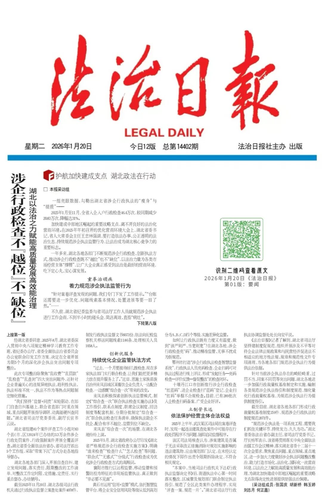 编者按:1月20日,中央政法委机关报《法治日报》一版“护航加快建成支点 湖北政法在行动”专栏刊发报道《涉企行政检查不“越位”不“缺位” 湖北以法治之力赋能高质量发展高效能治理》,推介湖北各地各部门不断规范涉企行政检查、创新执法方式,推动涉企行政检查既不“越位”也不“缺位”,以法治力量为各类市场经营主体“撑腰”,让广大企业吃下定心丸、安心谋发展的经验做法。全文如下。