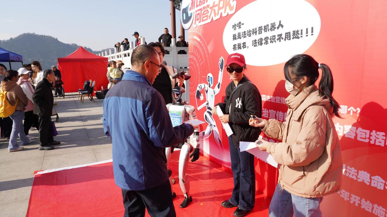 法治宣传互动专区里,机器人法律知识大PK、法治心愿墙、普法“摇一摇”等趣味活动吸引了大批市民参与,孩子们围着机器人追问法律问题,家长们则在打卡点写下法治心愿,共同拼贴成巨大的“法”字。