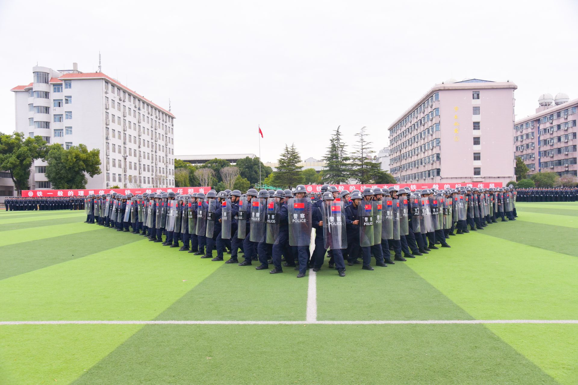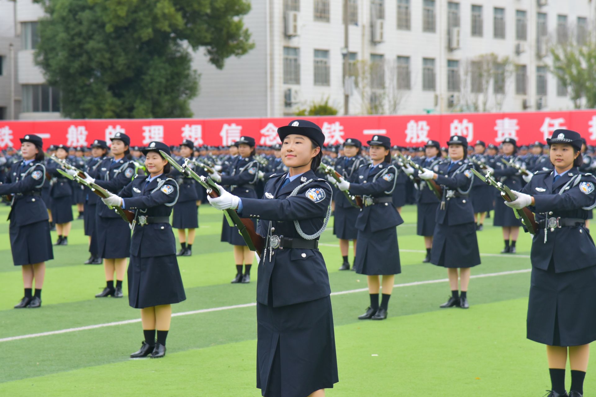 伴随着激昂的分列式进行曲,仪仗方队高擎党旗、国旗、警旗、校旗率先出场,警徽方队及27个徒步方队依次经过主席台接受检阅。同学们步伐铿锵、目光如炬,展现出严明的纪律素养与新一代警校学子的精神风貌。