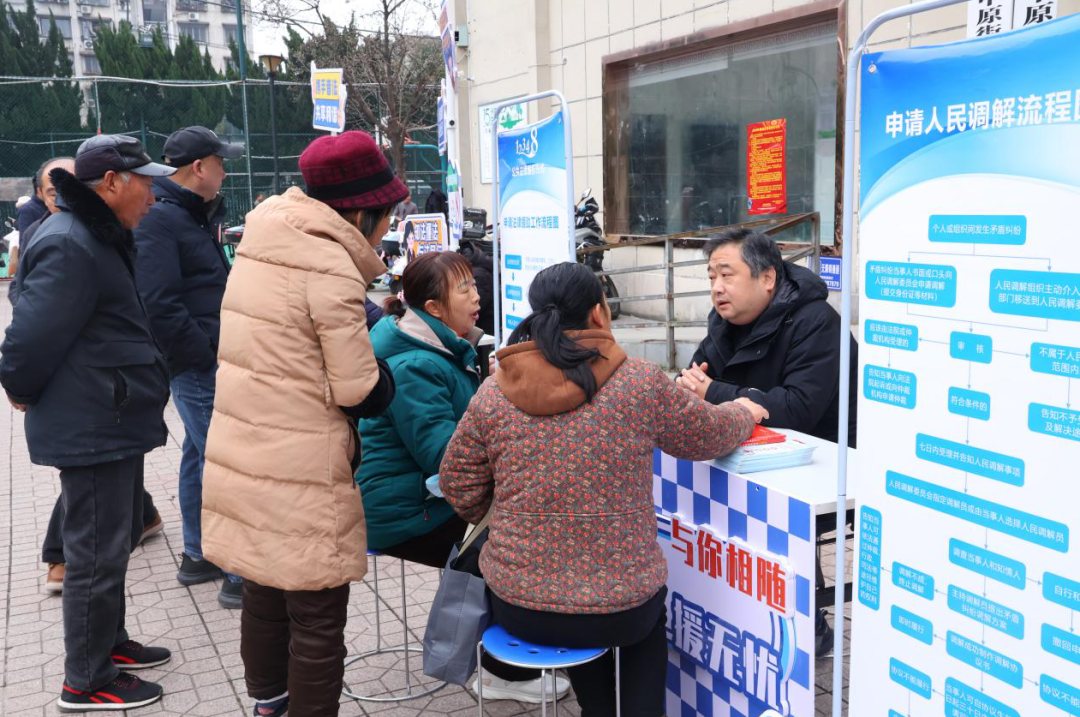 活动现场,法治摊位整齐排列,工作人员一边发放《中华人民共和国老年人权益保障法》《中华人民共和国民法典》《提高防范 谨防诈骗——致广大老年朋友们的一封信》等宣传折页纸,一边用通俗易懂的语言解答群众疑问。“邻里纠纷怎么调解?”“老年人权益如何保障?”“法律援助申请条件是什么?”针对大家关心的热点问题,工作人员结合真实案例细致普法;同时还告知人民调解“不收费、效率高”的优势以及法律援助的申请渠道、受理范围和所需材料,让法律服务更加触手可及。