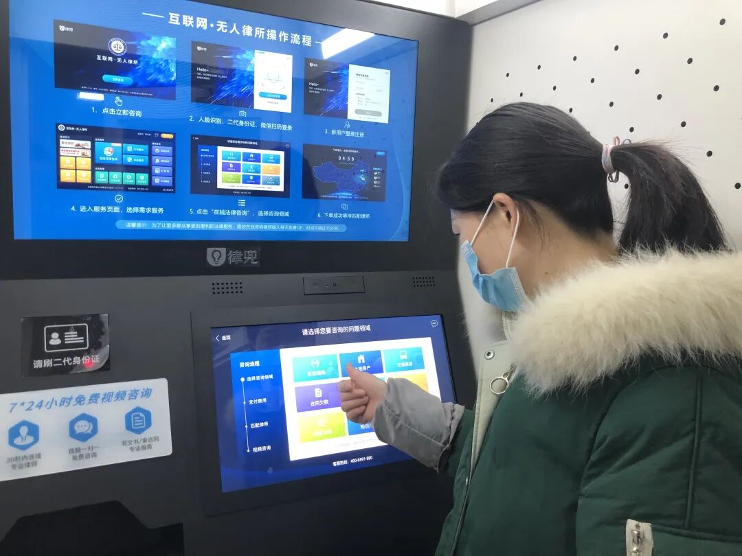 “我有个关于合同纠纷的问题,想来请教一下。”前不久,郧西县六郎司法所“无人律所”终端前,两岔河村村民张某通过自助服务终端机进行网上咨询,匹配到律师后,短短几分钟就得到了律师的专业解答。近年来,为了让公共法律服务覆盖面更广,郧西县推出“互联网无人律所”服务,在18个乡镇以及行政审批服务大厅等公共场所设立形似自助取款机的“无人律所”终端,办事群众只需在终端上扫描二代身份证或用微信扫码登录系统,30秒内即可匹配律师进行一对一在线服务。