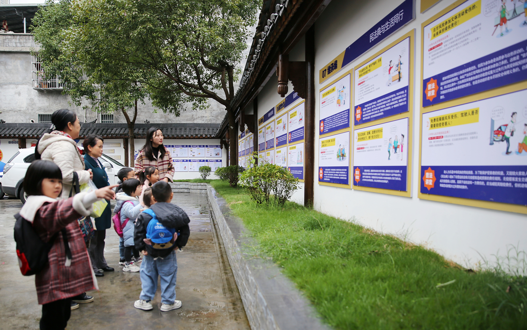 在柚乡苑社区文化广场上,不时有路过的村民停下脚步仔细阅读法律知识,还有大人为孩子指点讲解。