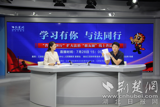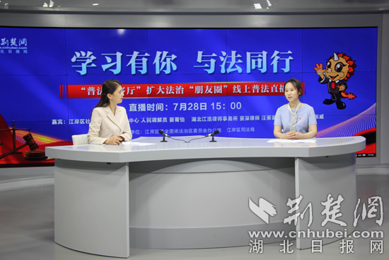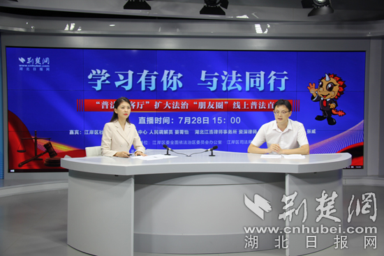 为学习宣传习近平法治思想,贯彻落实习近平总书记考察湖北武汉重要讲话精神,7月28日下午,由武汉市江岸区委全面依法治区委员会办公室、江岸区司法局主办,荆楚网(湖北日报网)承办的“学习有你 与法同行”暨“普法会客厅”扩大法治“朋友圈”线上普法直播活动成功举行。