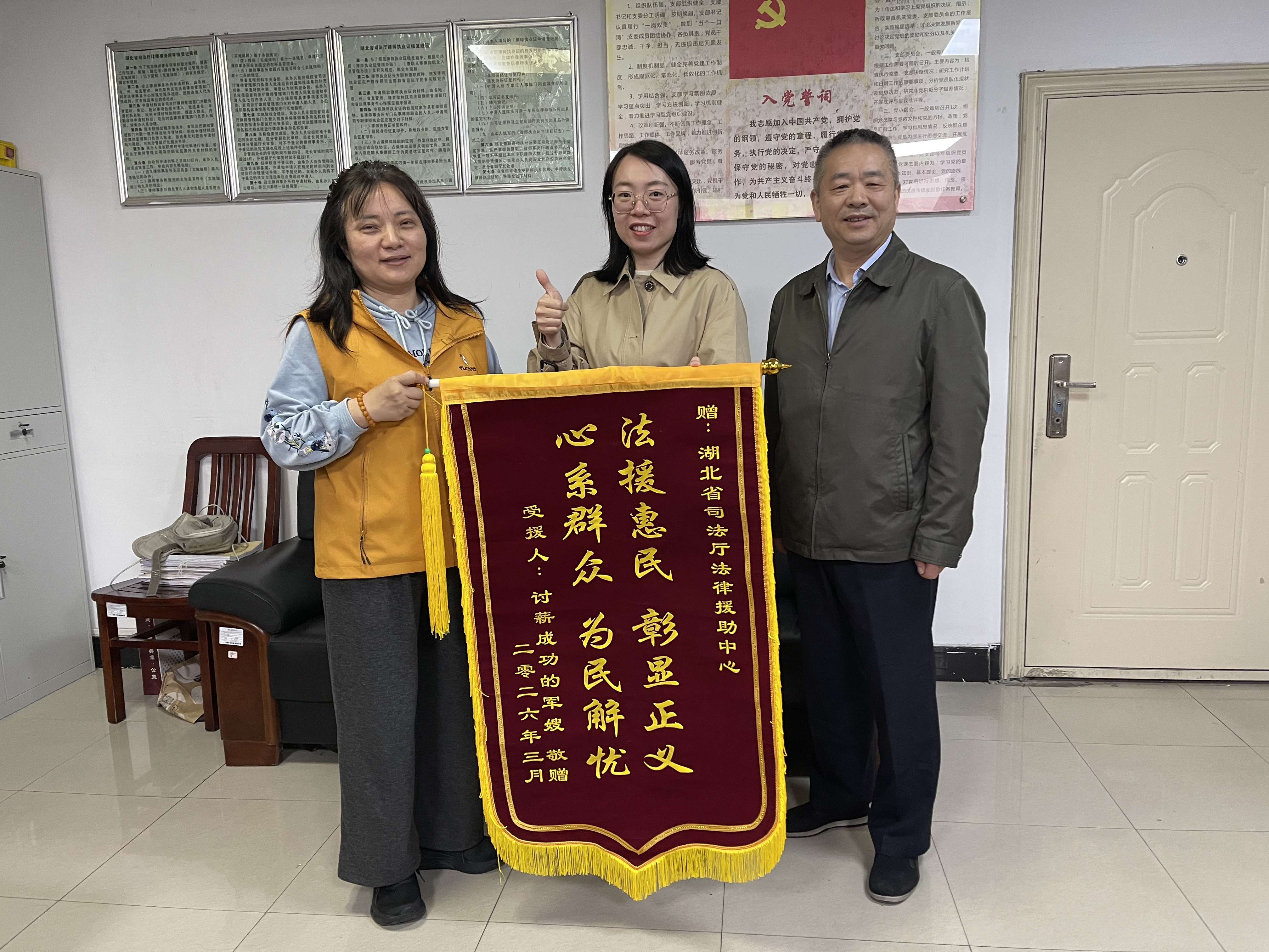 2026年4月22日,两位军属专程来到湖北省司法厅法律援助中心,送上绣有“法援惠民 彰显正义 心系群众 为民解忧”的锦旗;另一面写着“法律援助伸正义 维权讨薪暖人心”的锦旗,则赠予湖北中和信律师事务所的龚婧、肖乾律师。锦旗背后,是一个关于信任、专业与坚守的故事。