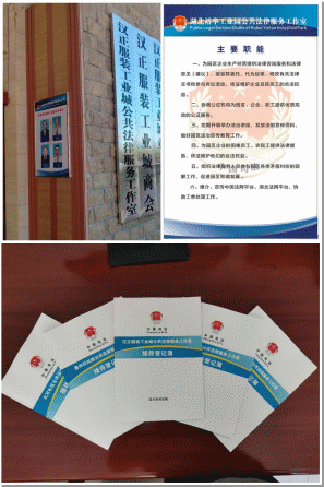 “一室”即在五大工业园区建立公共法律服务工作室。经多方沟通协调,先后在西江北河工业园、浙商产业园、汉正服装工业城、德州科技园、湖北裕华工业园五个工业园区成立公共法律服务工作室。公共法律服务工作室统一标识标牌,统一服务事项,统一服务清单、统一工作流程。工作室除为企业和企业员工提供法律咨询、法律法规和典型案例查询、法律服务指引、人民调解、法治宣传、法律援助、法治体检等免费服务项目外,还通过公示服务清单及收费标准的方式,为园区及园区企业提供多层次多种类的律师、公证、司法鉴定、仲裁等专业法律服务。